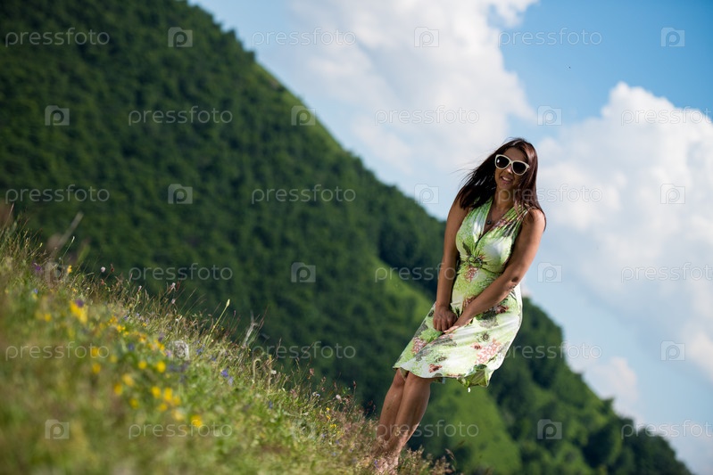 Молодая женщина в платье стоит на траве