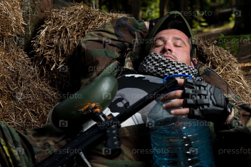 Игрок в пейнтбол отдыхает на земле