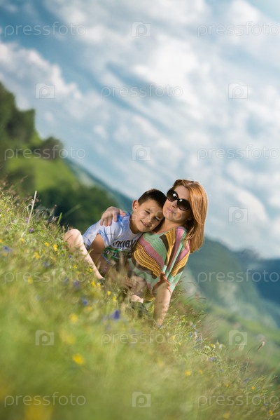 Мать с сыном сидят на поле