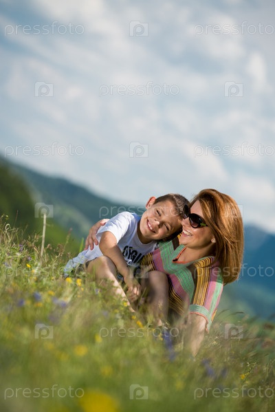 Мать с сыном сидят на поле