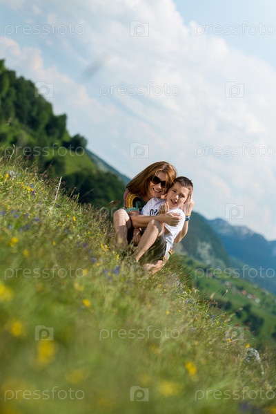 Мать с сыном сидят на поле