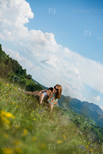 Мать с сыном сидят на поле
