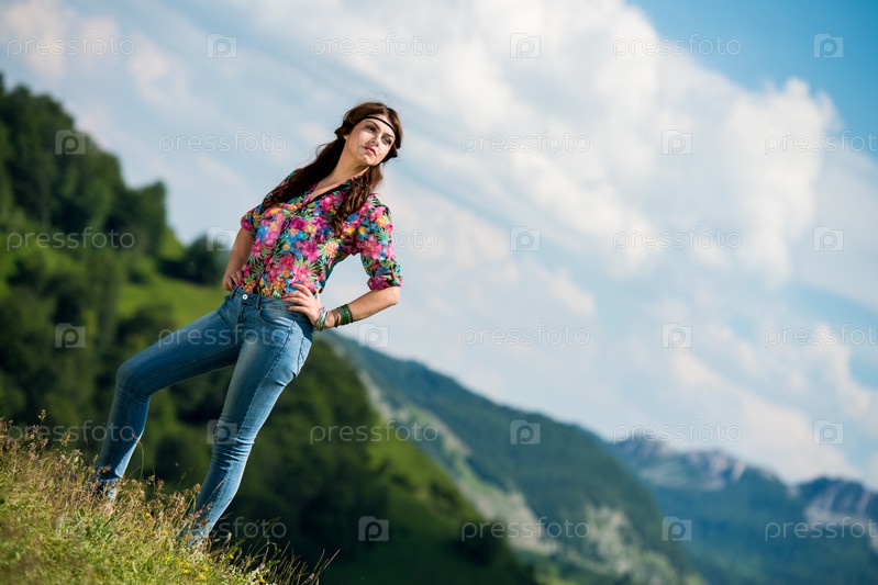 Красивая женщина в джинсах стоит на траве
