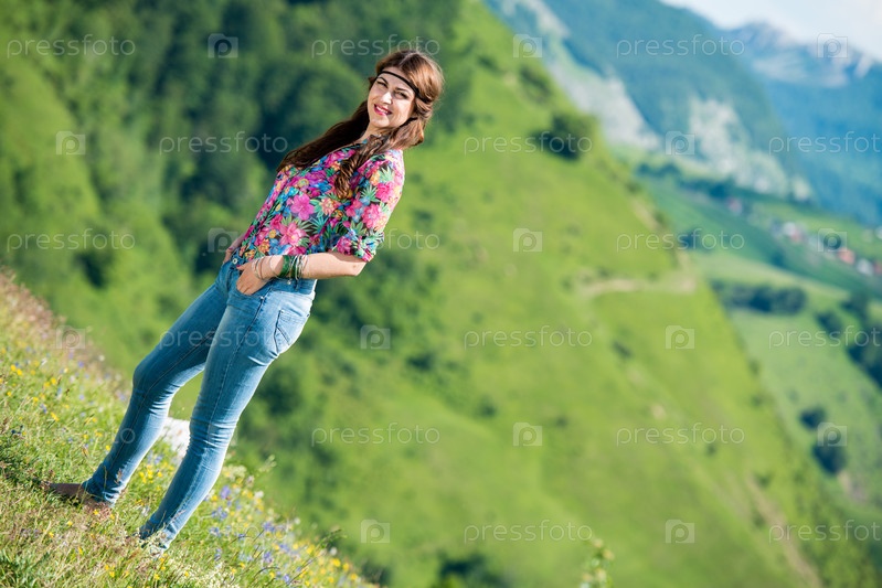 Красивая женщина в джинсах стоит на траве