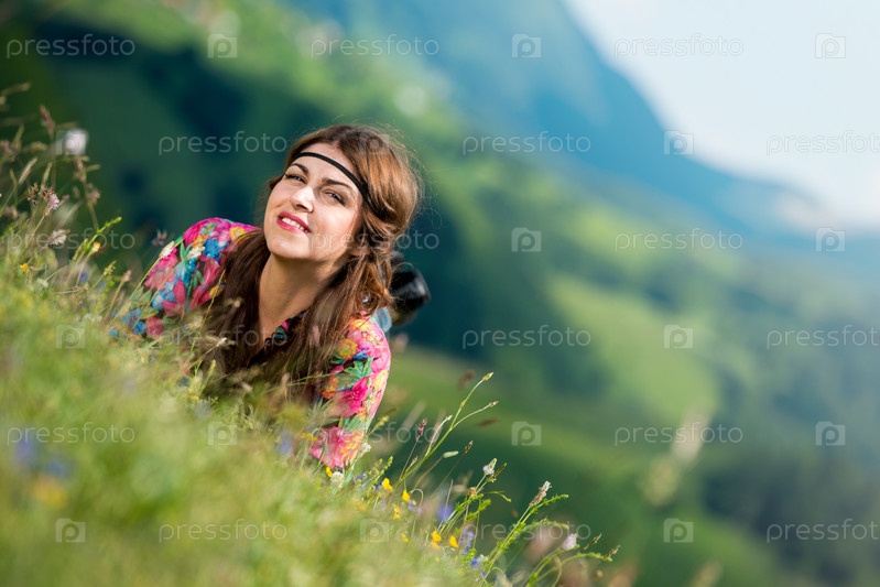 Красивая женщина лежит на траве