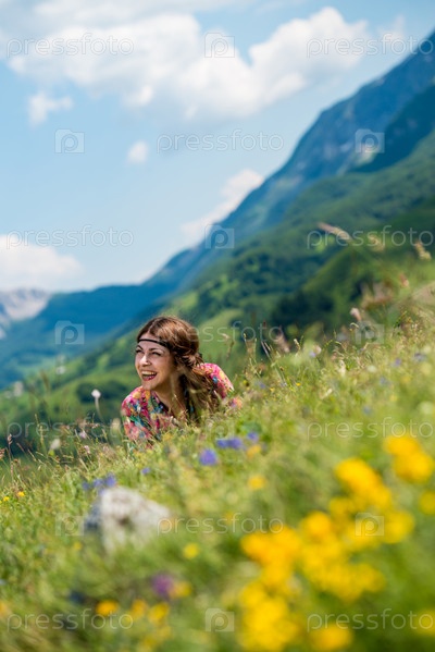 Красивая женщина лежит на траве