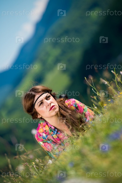 Красивая женщина лежит на траве