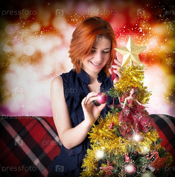 Счастливая улыбающаяся рыжая девушка разговаривает по телефону и наряжает елку.Праздничные тарифы сотовой связи