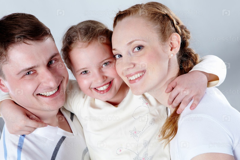 Молодая семья на сером фоне