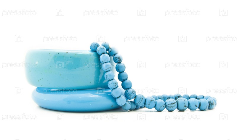 Бусы и браслеты из бирюзового цвета на белом фоне