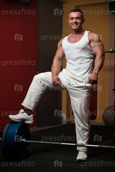 Сильный мускулистый мужчина стоит в фитнес-клубе