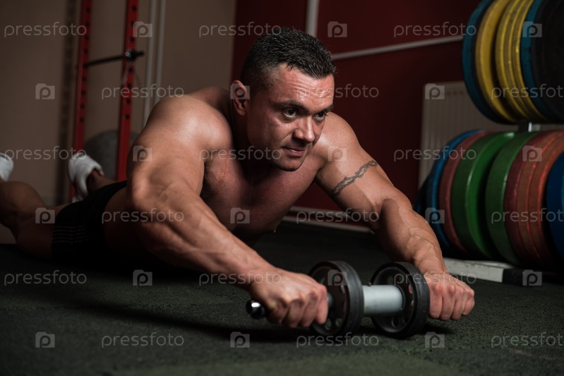 Мускулистый культурист делает упражнение с роликом