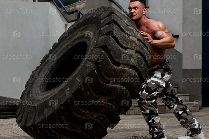 Мускулистый мужчина тренируется с шиной, кросс-фит