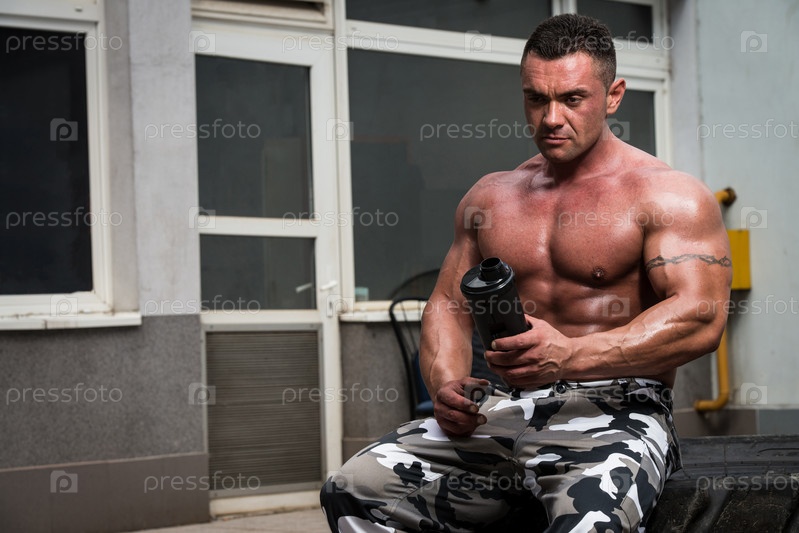 Культурист отдыхает и пьет протеиновый коктейль после тренировки в тренажерном зале