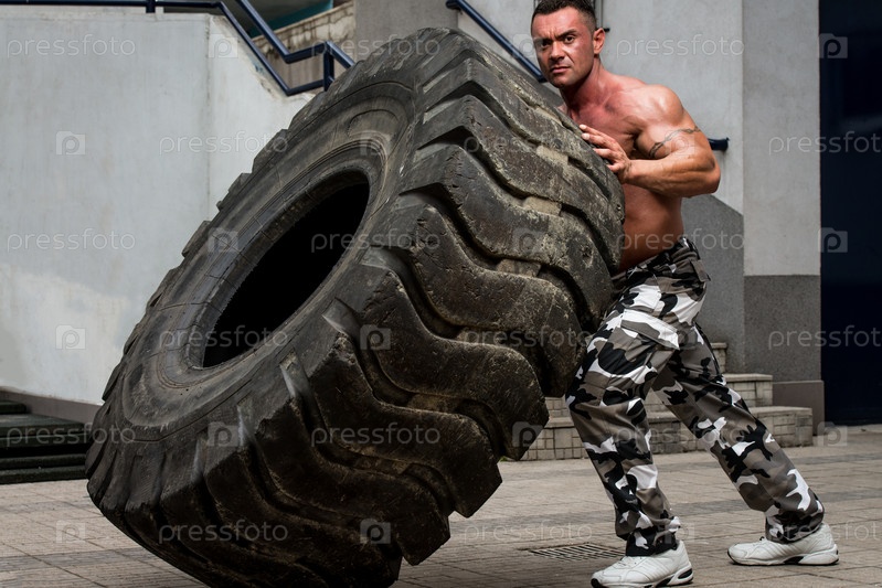 Мускулистый мужчина тренируется с шиной, кросс-фит