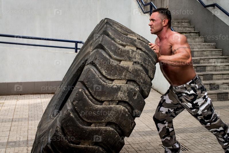 Мускулистый мужчина тренируется с шиной, кросс-фит