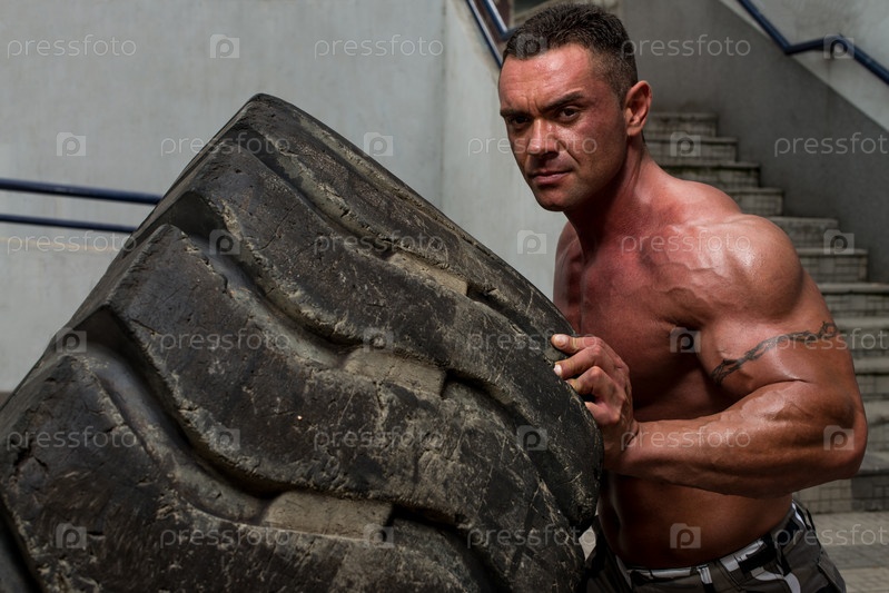 Мускулистый мужчина тренируется с шиной, кросс-фит
