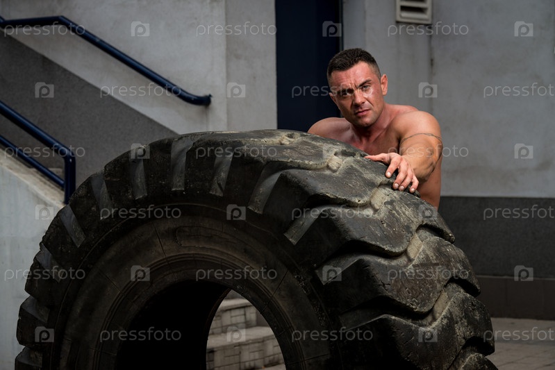 Мускулистый мужчина тренируется с шиной, кросс-фит