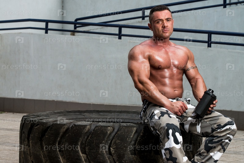 Культурист пьет протеиновый коктейль после тренировки в тренажерном зале