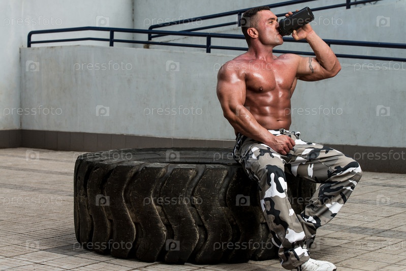 Культурист пьет протеиновый коктейль после тренировки в тренажерном зале