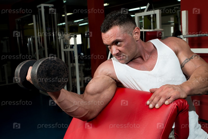 Человек в тренажерном зале делает упражнение для бицепсов с гантелями