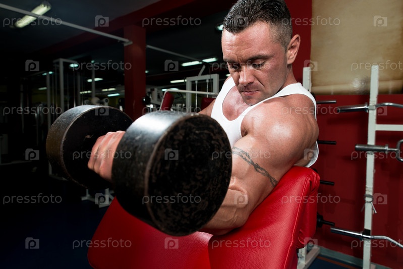 Человек в тренажерном зале делает упражнение для бицепсов с гантелями