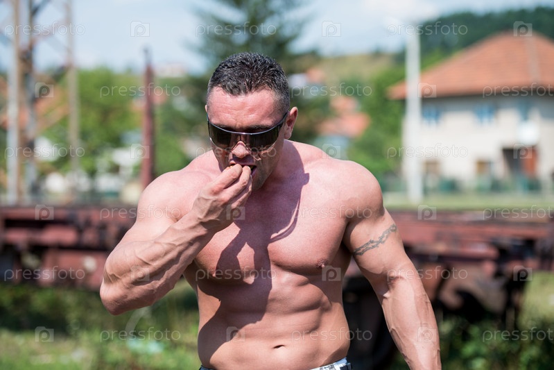 Мускулистый мужчина ест блины
