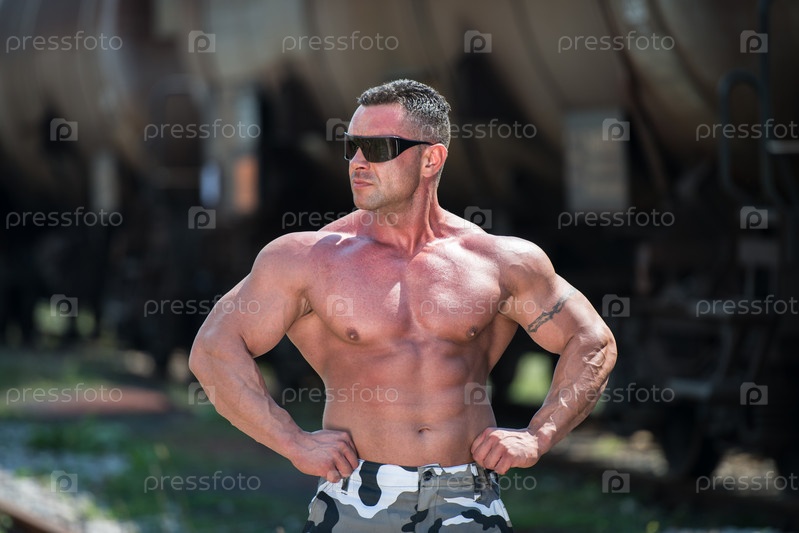 Культурист позирует на железной дороге