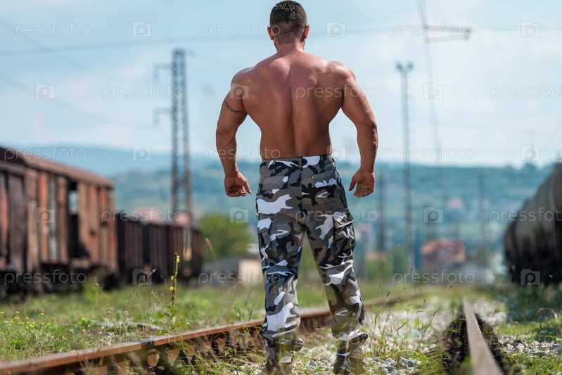 Бодибилдер позирует на железной дороге
