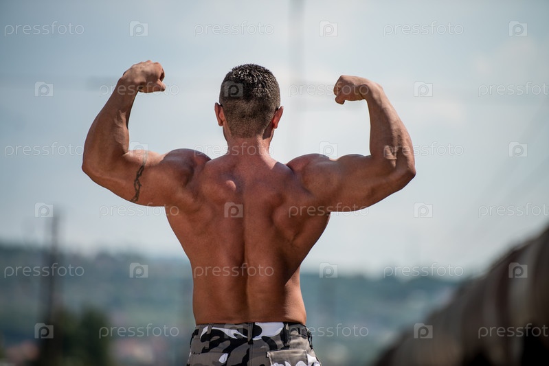 Бодибилдер демонстрирует бицепсы