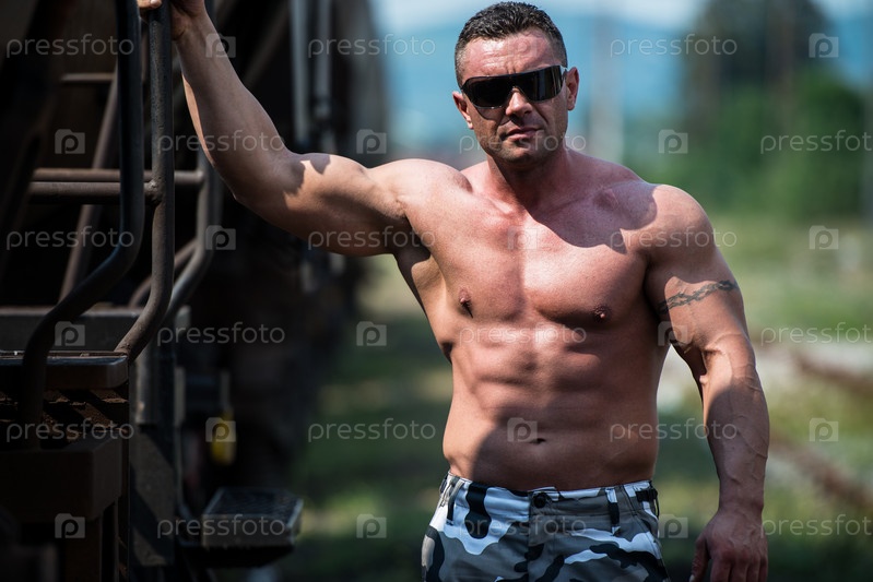 Культурист позирует на железной дороге
