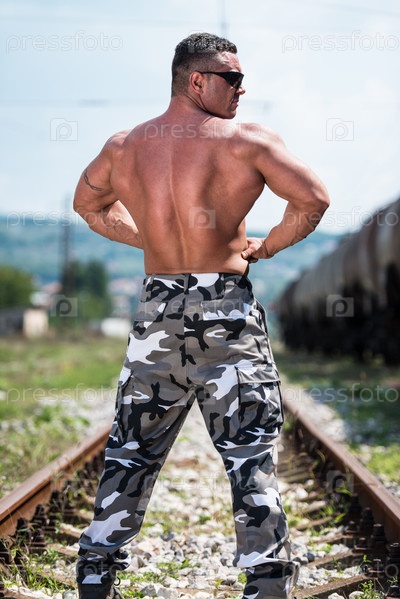 Культурист позирует на железной дороге