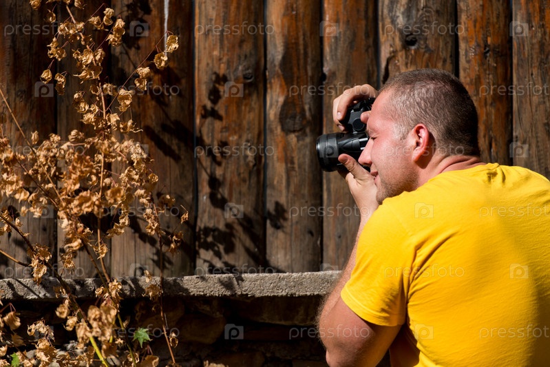 Молодой человек фотографирует зеркальным фотоаппаратомм