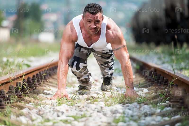 Мужчина стоит на низком старте