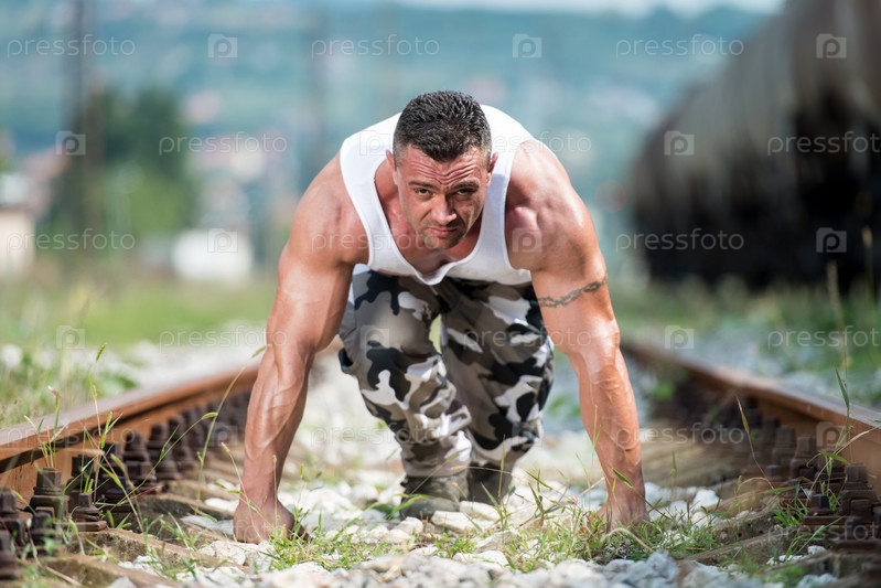 Мужчина стоит на низком старте