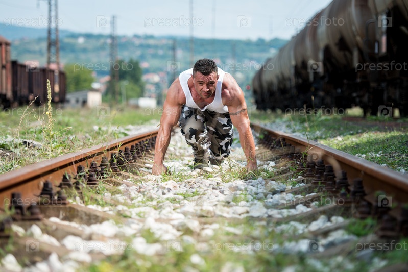Мужчина стоит на низком старте