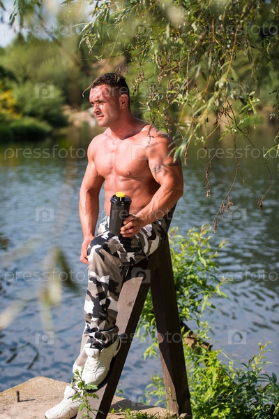 Культурист отдыхает и пьет протеиновый коктейль