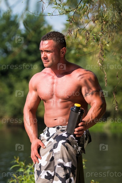 Культурист отдыхает и пьет протеиновый коктейль