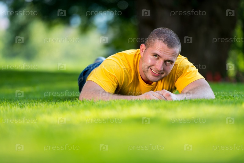 Мужчина лежит на траве в солнечный день