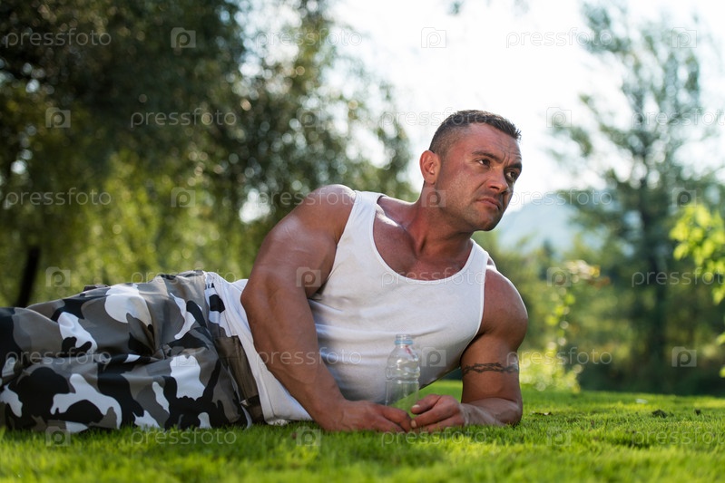 Культурист лежит на траве и держит бутылку воды