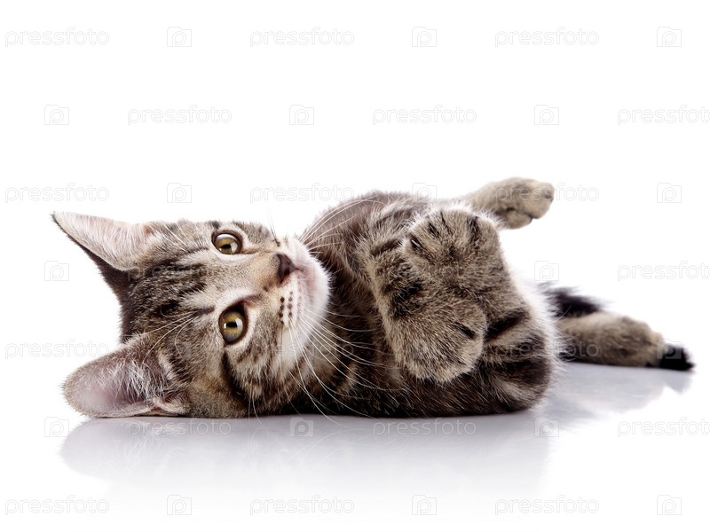 Полосатый не породистый котенок на белом фоне. Маленький хищник. Маленькая кошка