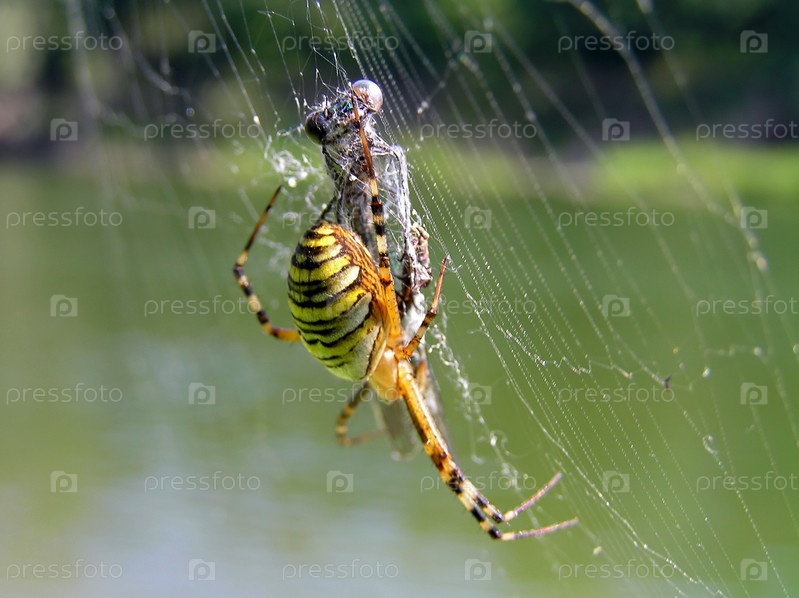 Паук-оса с жертвой крупным планом