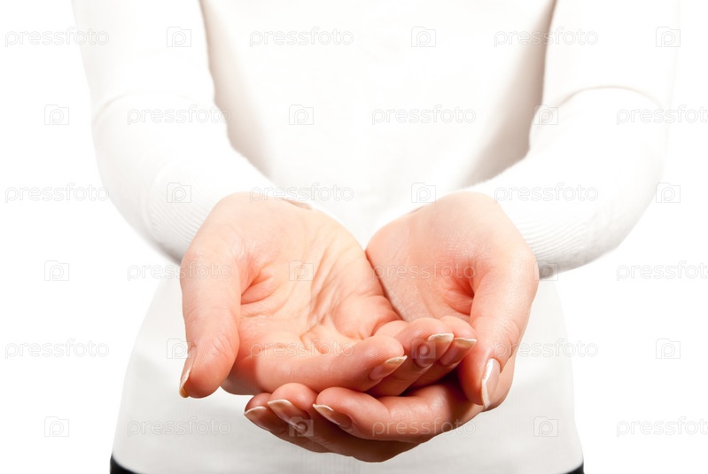 Женщина держит руки ладонями вверх, белый фон