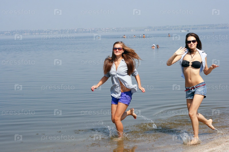 Счастливые молодые женщины бегут по воде вдоль пляжа