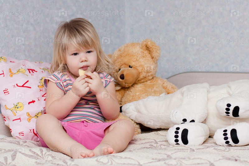 Маленькая девочка ест кусочек яблока, сидя на кровати