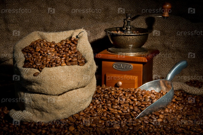 Натюрморт с кофемолкой и мешком с кофейными зернами