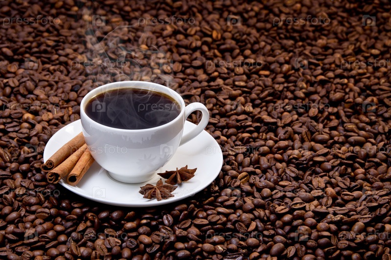 Белая фарфоровая чашка с горячим кофе, палочками корицы и бадьяном на фоне кофейных зерен