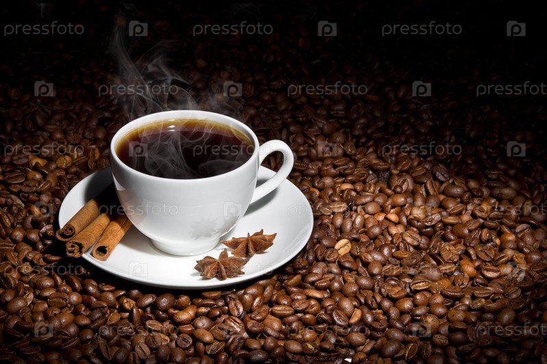 Белая фарфоровая чашка с горячим кофе, палочками корицы и бадьяном на фоне кофейных зерен