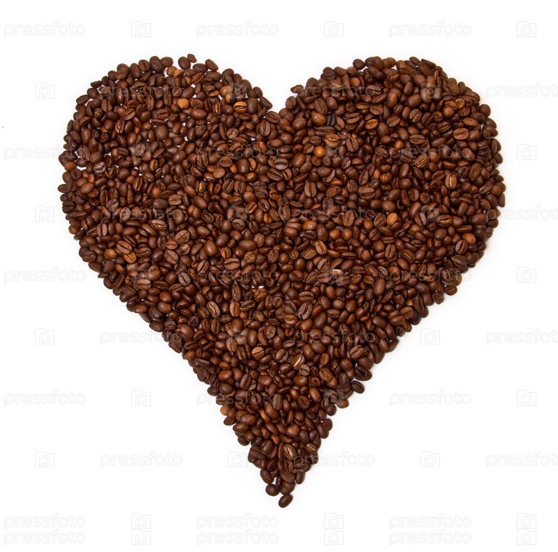 Жареные кофейные зерна выложены в форме сердца на белом фоне