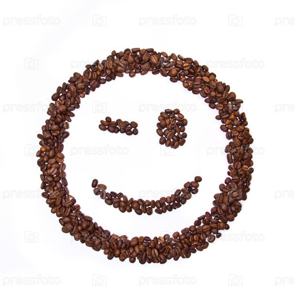 Жареные кофейные зерна выложены в форме подмигивающего смайла на белом фоне